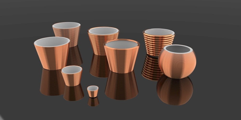 Available in a variety of classic planter forms, the Coil Coil Planters are wrapped in a continuous band of copper. Exposed to wind and rain over time, the copper acquires a patina unique to its environmental circumstances, each planter expressing the conditions of the site in an individualized way.