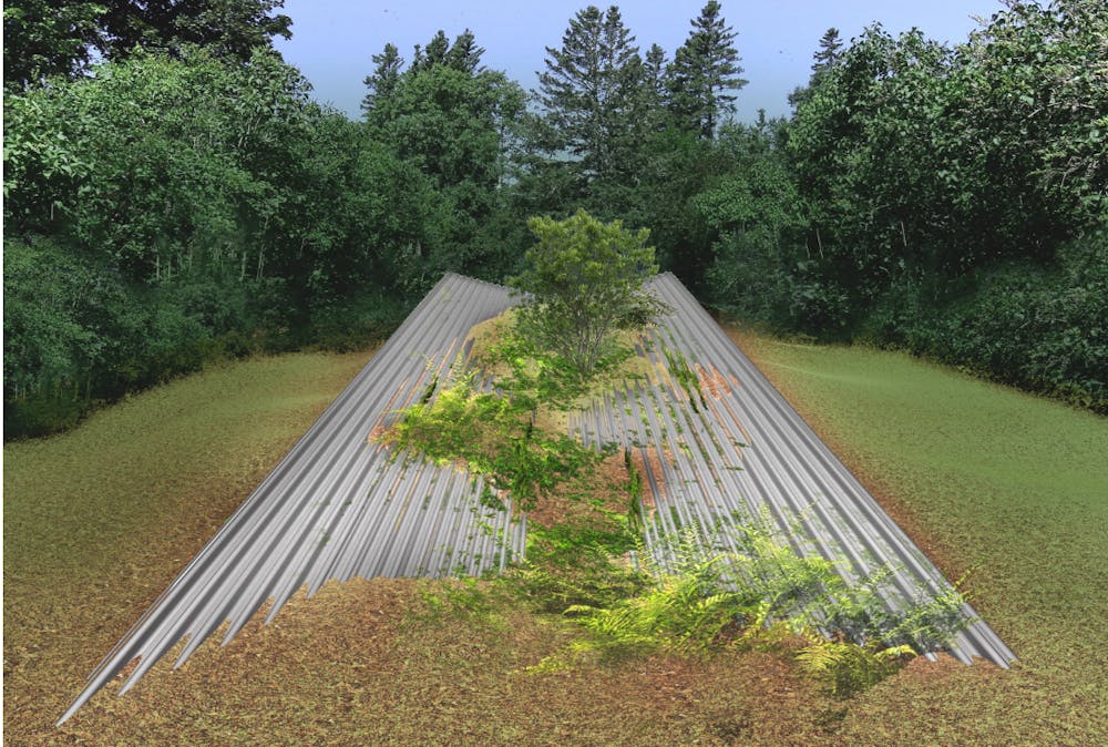 Our "reclaimed metal field" is inspired by the latent ecologies of the urban, built environment. The design, a proposal for the Jardin de Metis, is complete with inclined irrigation systems to allow for the movement of sediment to play its due role in the poeticism of the installation. From impromptu tree wells springing from cracks in the pavement, to moss growing under the bleachers in a sports stadium, contrasts of machined surfaces and organic growth introduce an aesthetic of rawness. We designed an homage to these moments, with deference to natural growth.