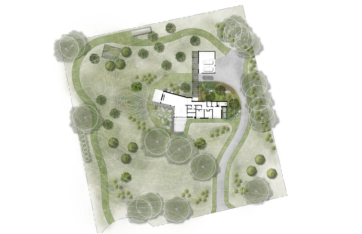 The planting plan considers existing trees, and thoughtfully fills out the naturalistic landscape with more trees, shrubs, a meadow, which together form entryway flow and an invitation toward quiet observation.